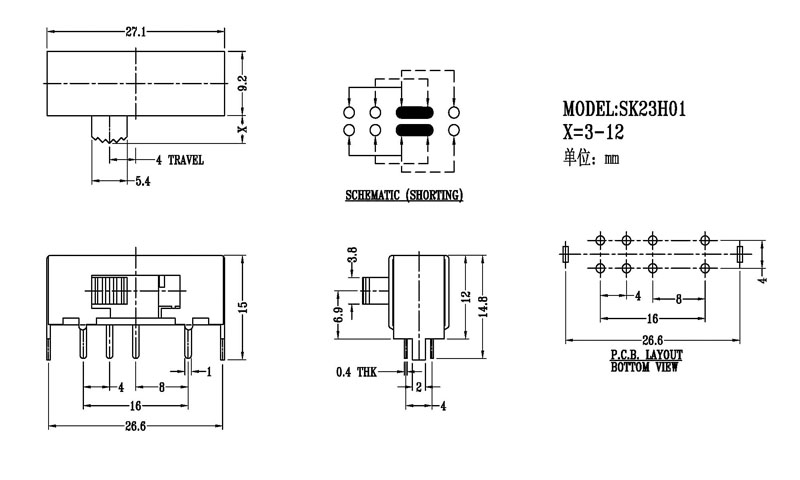 撥動開關(guān)SK-23H01電路圖: