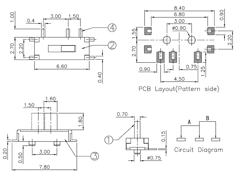 微型撥動(dòng)開關(guān)技術(shù)參數(shù):